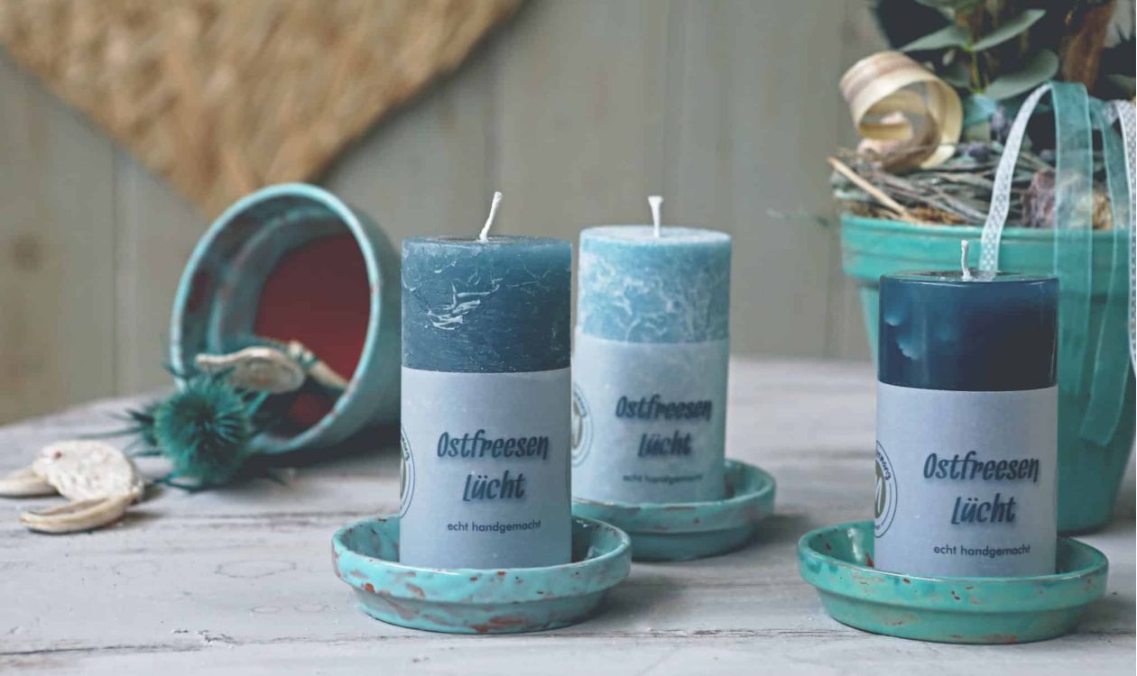 Ostfreesen Lücht für laue Sommerabende. Unsere Stumpenkerzen gibt es in rund und eckig, in zwei unterschiedlichen Oberflächen und in ansprechenden maritimen Farben.